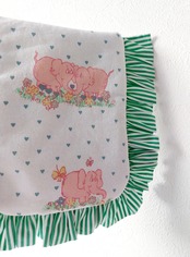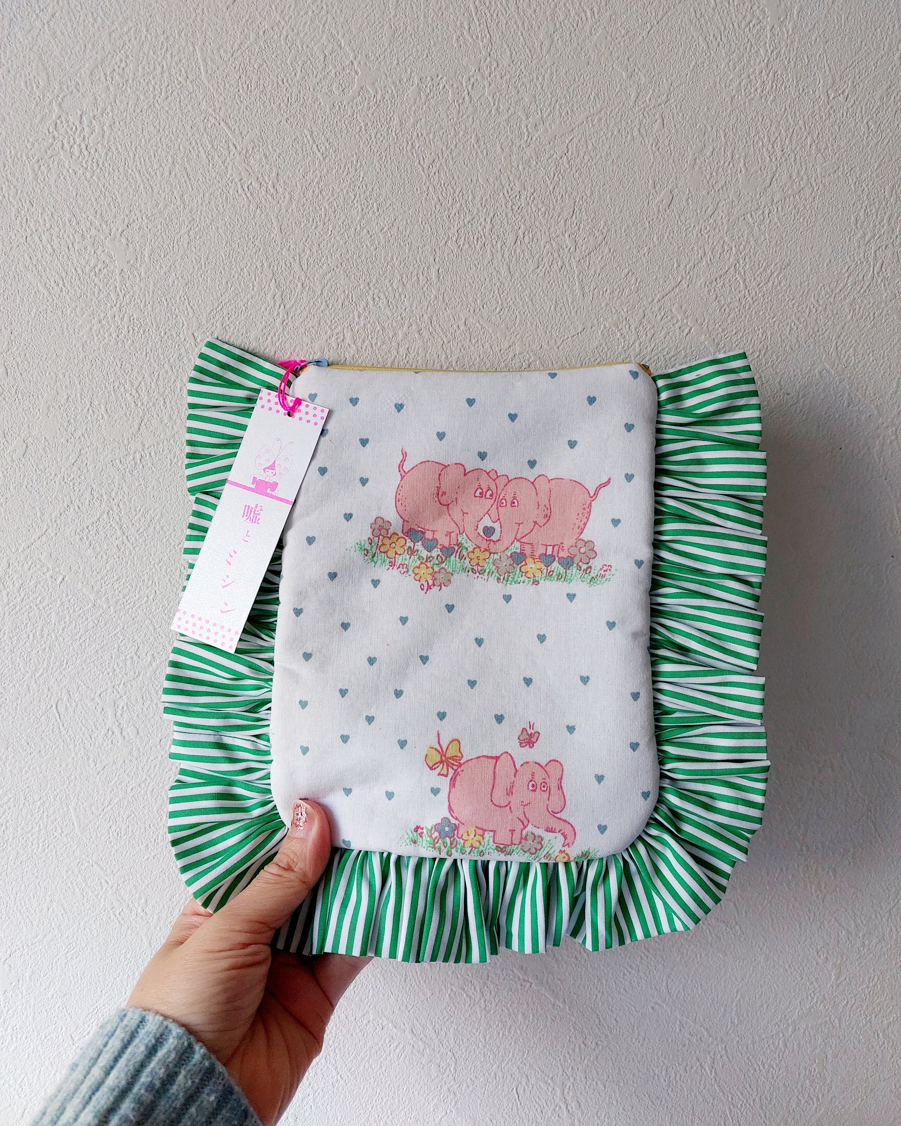 嘘とミシン○ヴィンテージフリルポーチ(ゾウのカップル/グリーンストライプ)