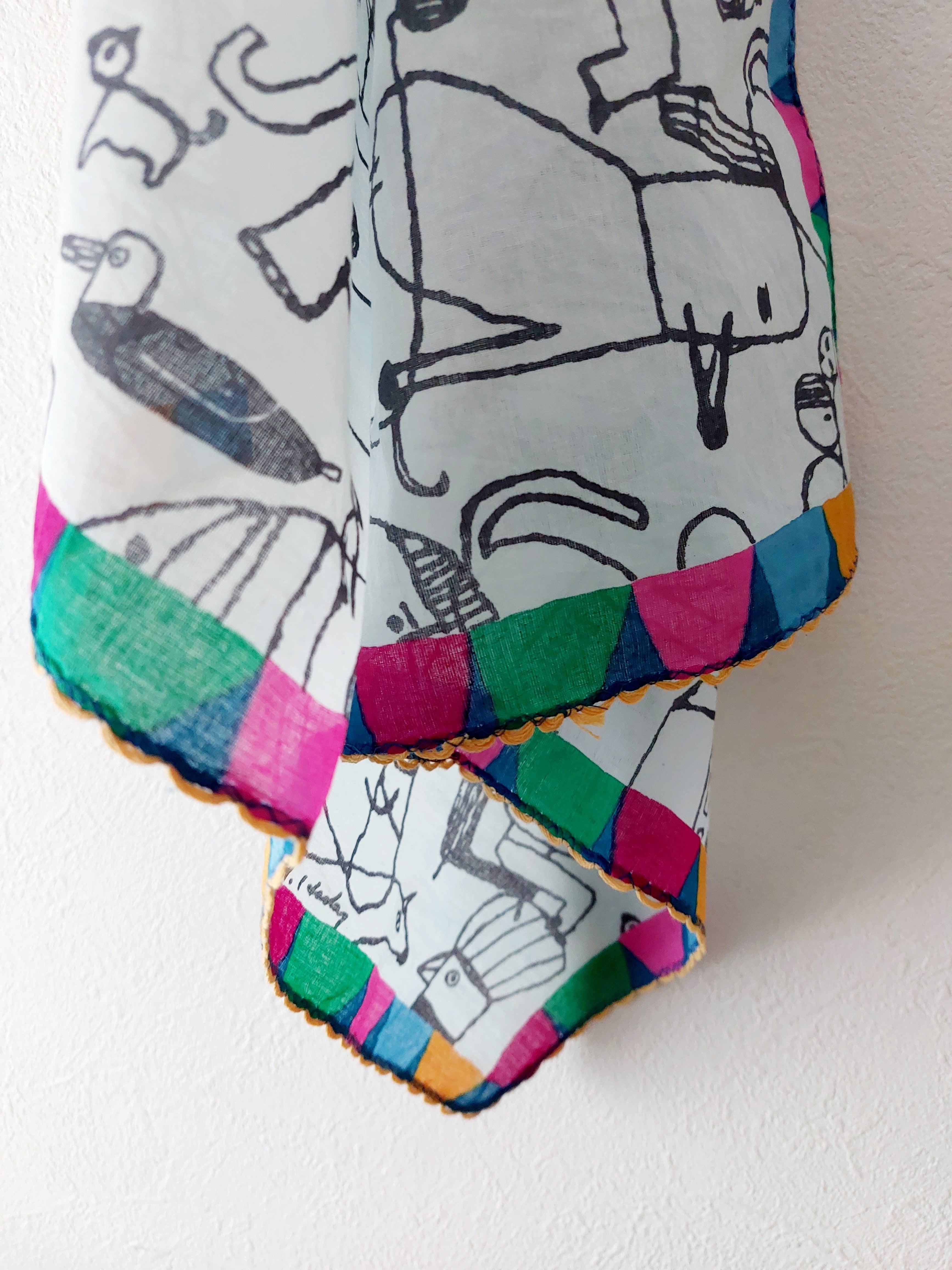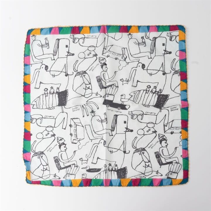 カラフルな縁取りと独特なイラストが可愛い波田佳子さんデザインの大判ハンカチです。