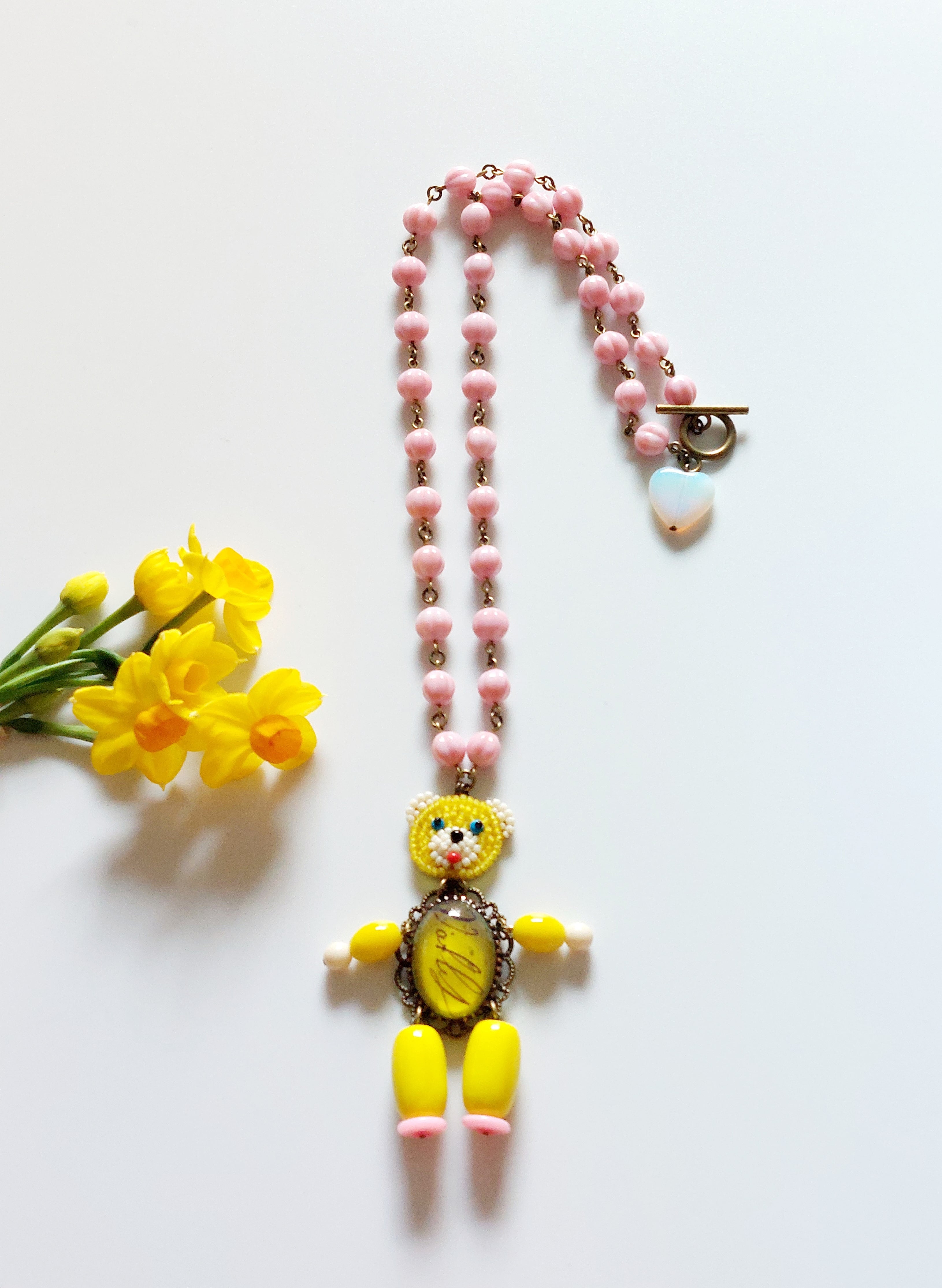 苺ミルクチョコレートみたいなチェコビーズを合わせてハートのチャームもついてます。
