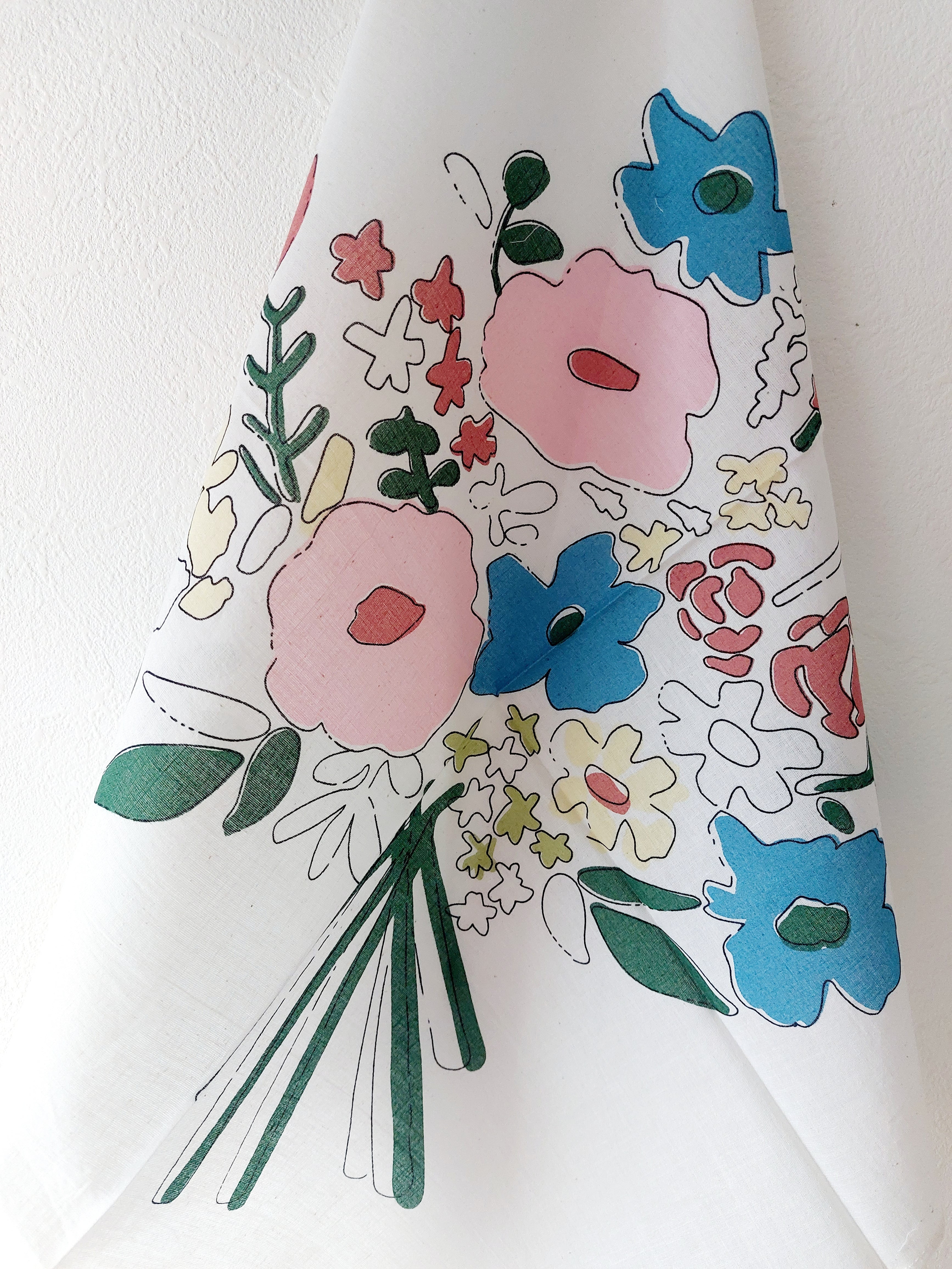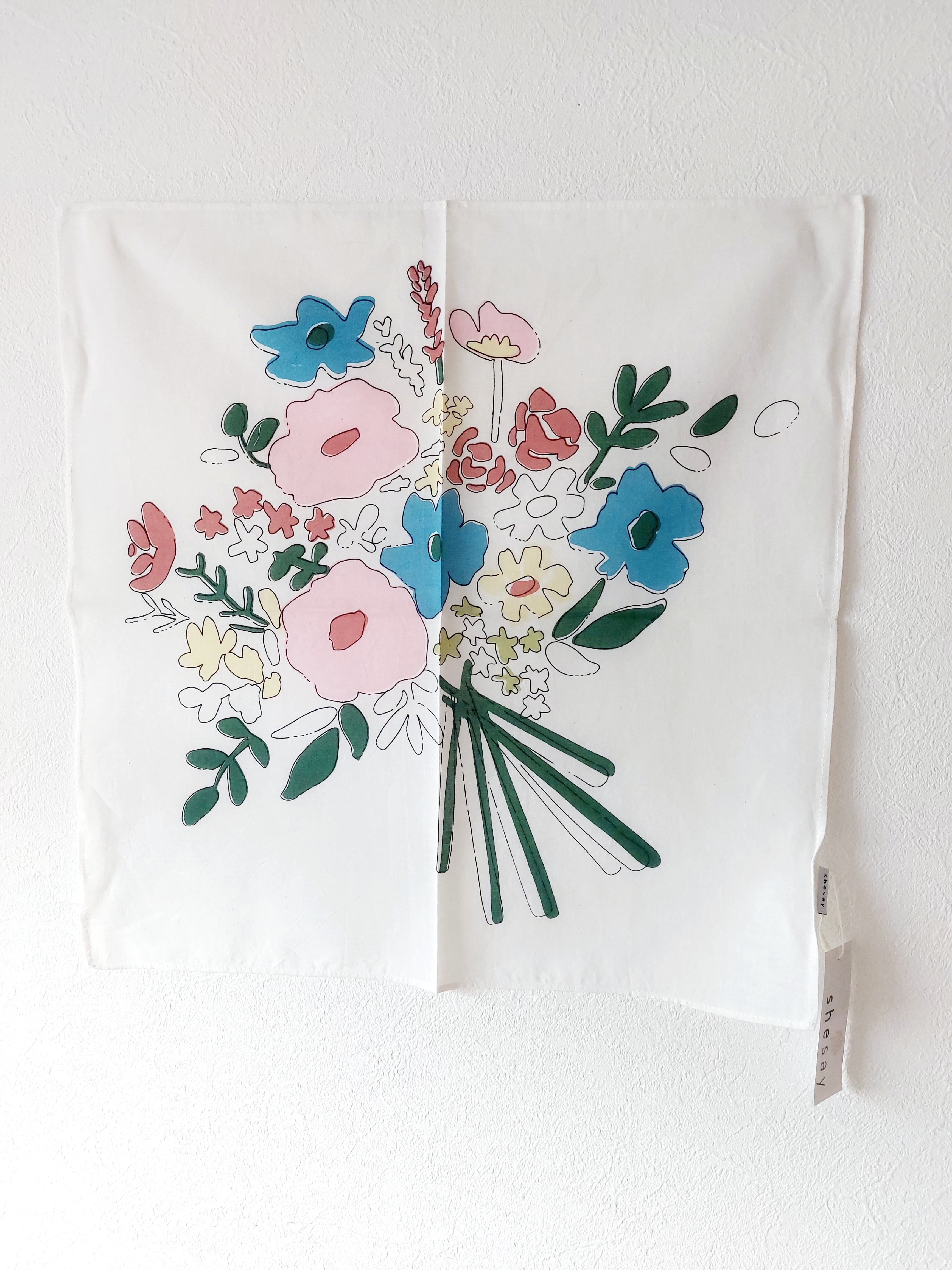 カラフルで遊び心あふれるカラーの花々がふわっと広がるブーケを描いたハンカチ。