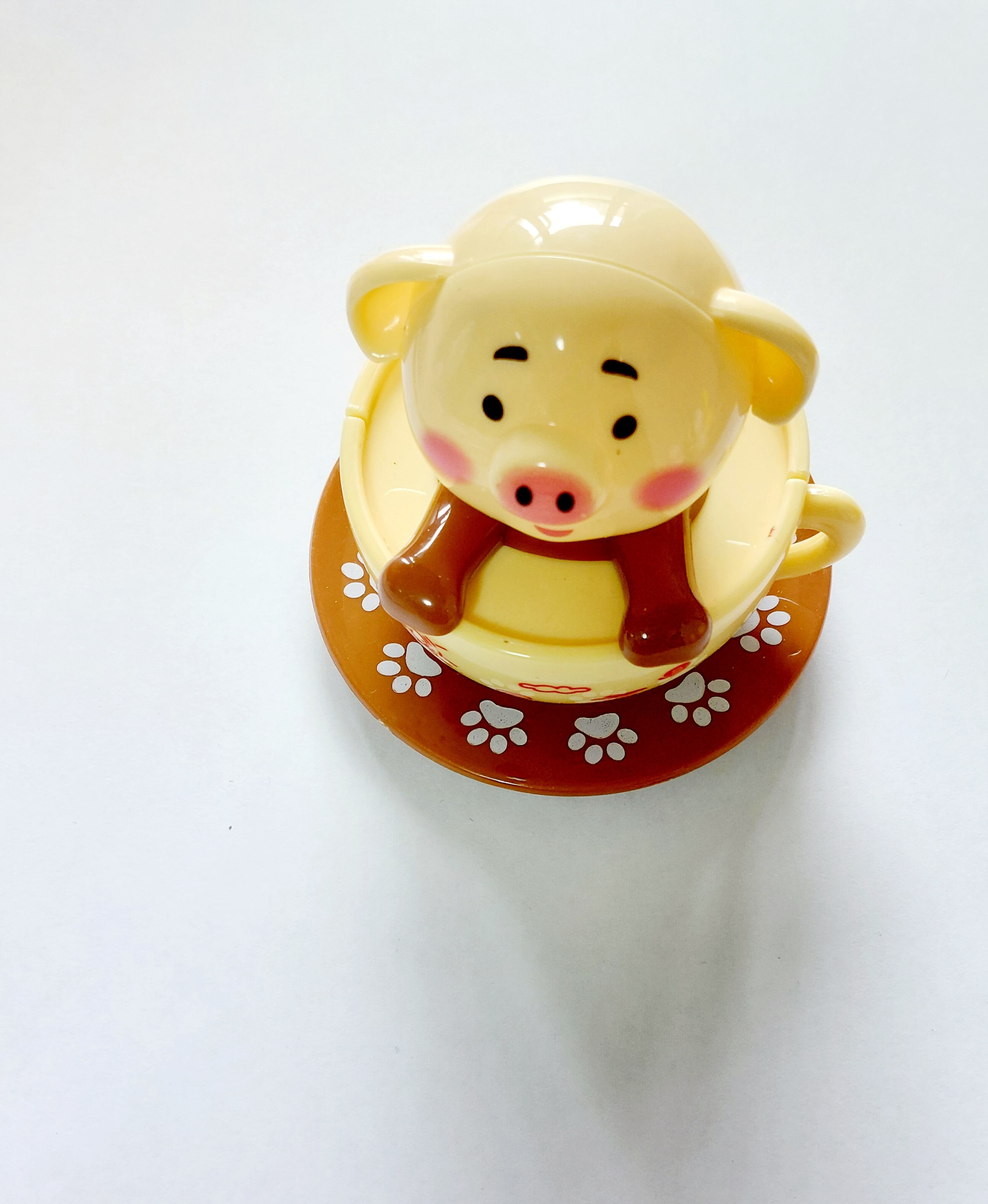 コーヒーカップに乗ってくるくる回るブタさんのおもちゃ。
