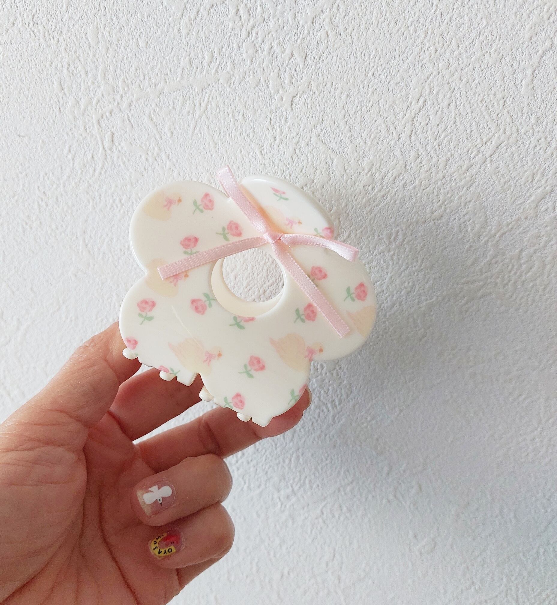 お花型にリボンがあしらわれたラブリーなバンスクリップです。
