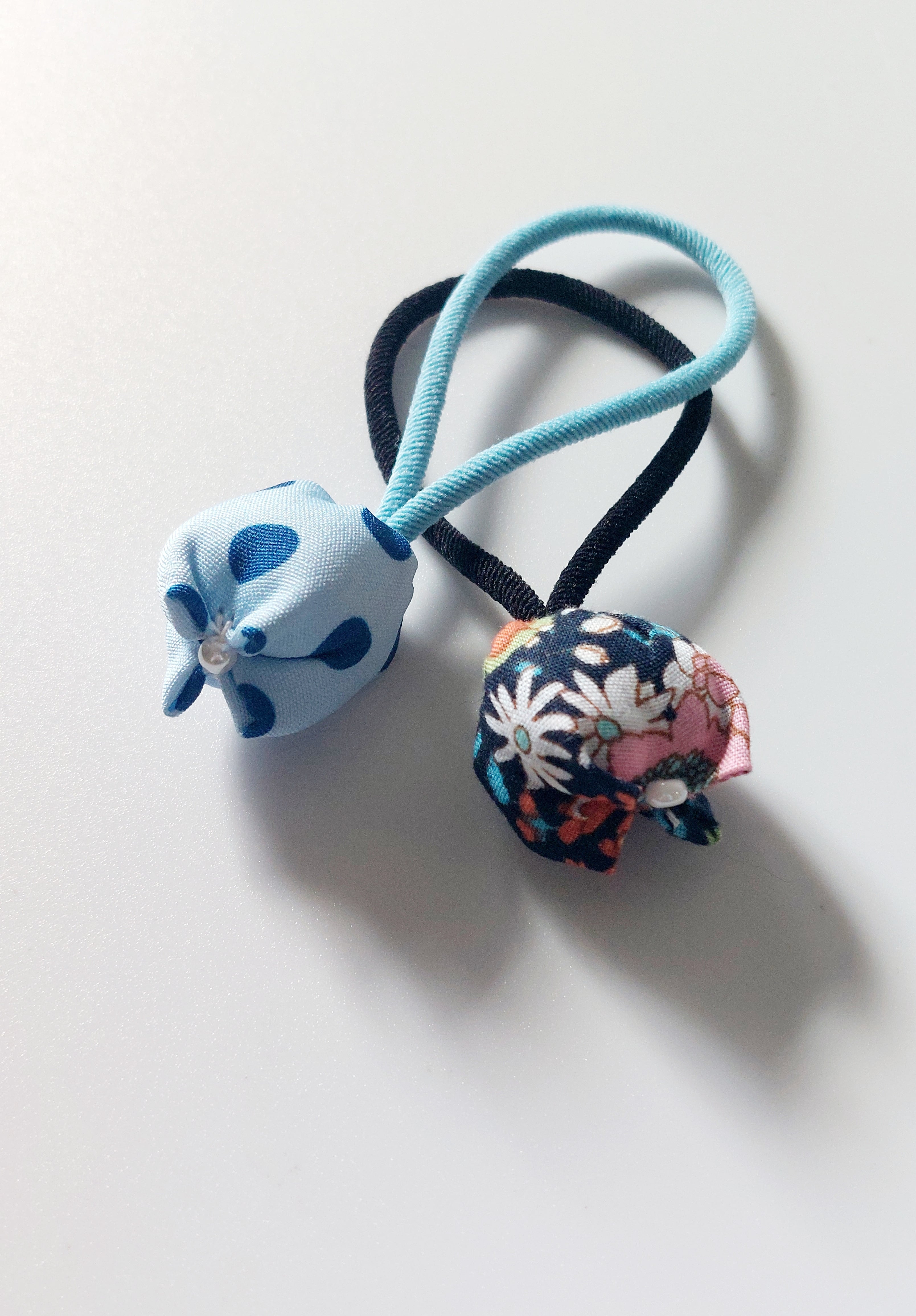 かわいいファブリックを使った蕾のかたちのヘアゴムです。